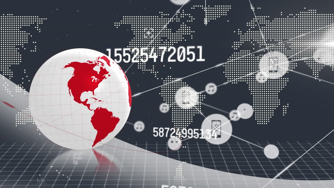 Digital depiction of a red and white globe with interconnected network points overlaying a world map. Suitable for illustrating concepts of global networking, data flow, international connectivity, and modern technological communication. Perfect for use in tech presentations, network software advertising campaigns, or articles about global communication.