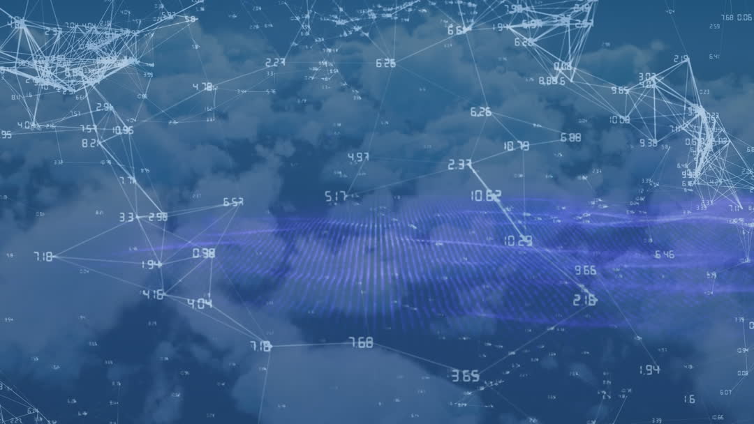 Network of digital connections overlaid on cloudy sky mixed with waves of data visualization. Perfect for illustrating concepts of global networking, business technology, cloud computing, and abstract data integration. Useful in presentations on cutting-edge technologies, futuristic designs, or for thematic backgrounds in tech-related media.