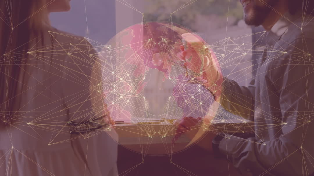 This visual features an overlay of interconnected global networks juxtaposed with two professionals engaging in conversation. Emphasizing themes like collaboration, global business, and digital transformation, this videory is ideal for use in conveying modern networking, international partnerships, or illustrating broad digital interconnectedness on business websites, corporate presentations, or global communication campaigns.