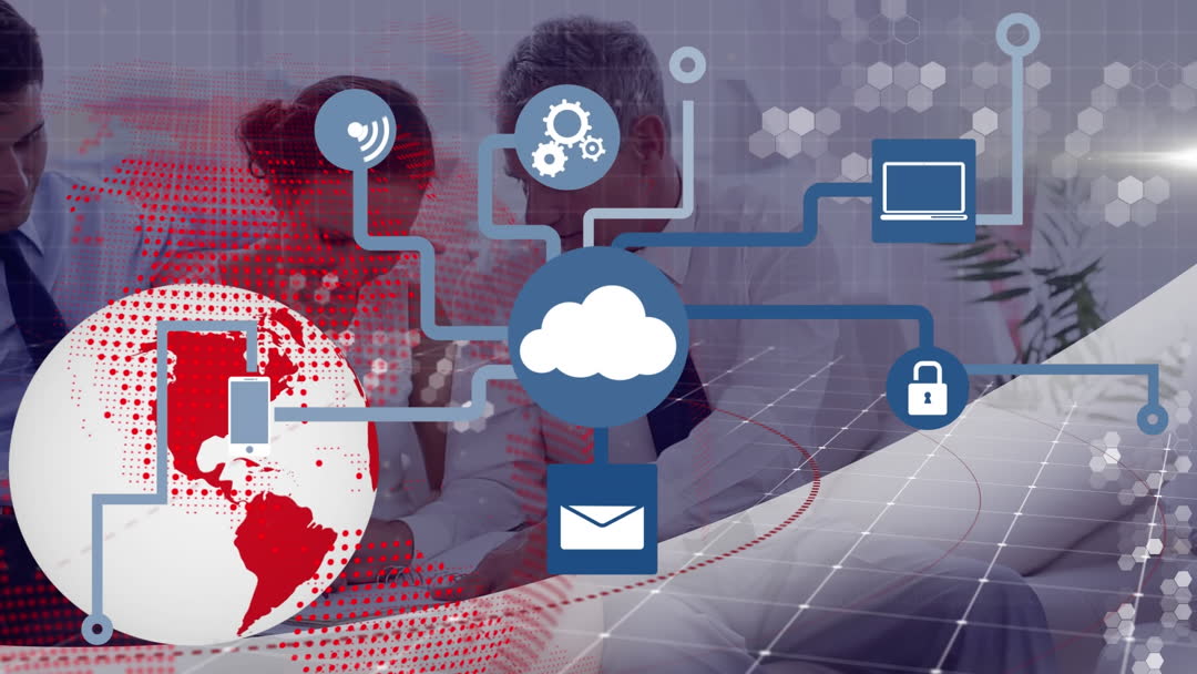 Illustration of global network connections showing interconnected technology icons like cloud, laptop, and locks overlayed on world map. Perfect for technology-related presentations, digital strategy concepts, cybersecurity awareness, and illustrating global communication networks.