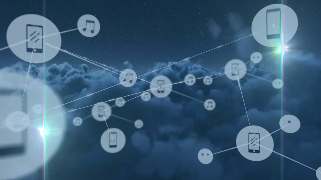 Visual representation of digital networks with icons including smartphones and music notes interconnected across a cloudy night sky. This concept highlights global communication, technology integration, and data sharing. Useful for illustrating topics on cloud computing, IT services, future technology visions, and wireless communications.