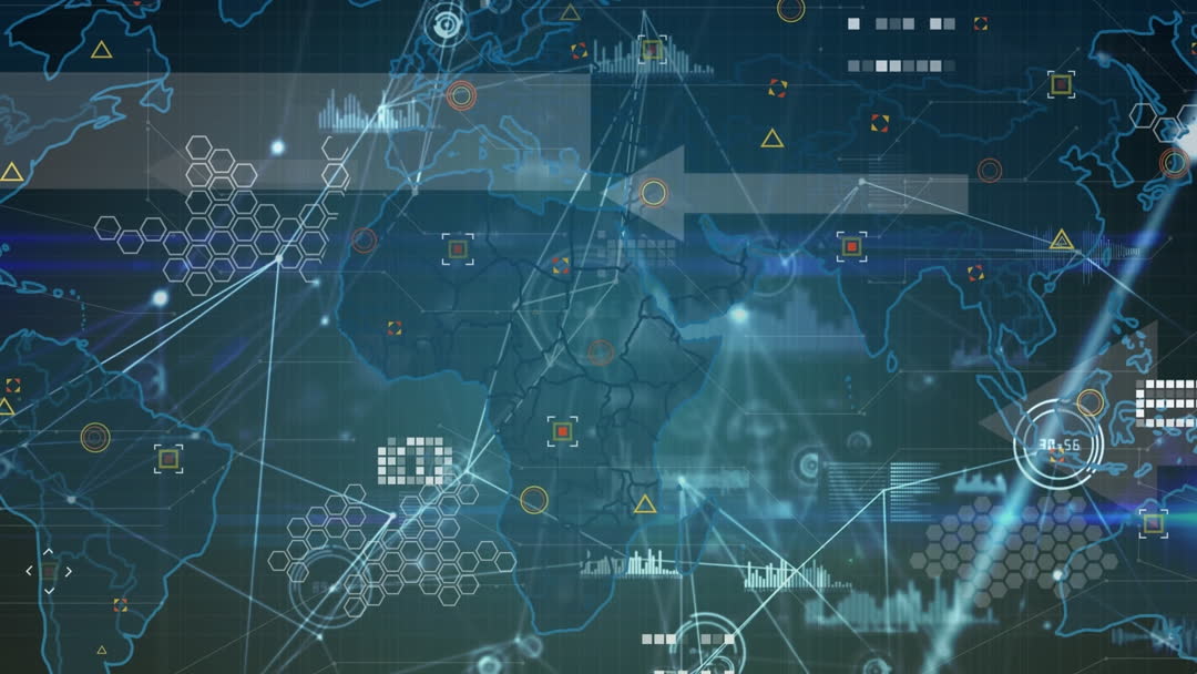 Dynamic animation illustrating digital connections over a world map. Various nodes, numbers, and processing elements emphasize themes like global communication, technology development, and data management strategies. Useful for presentations on international business, cybersecurity concepts, digital innovation, or tech-driven infographics.