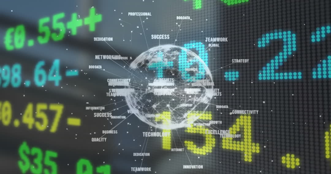 Dynamic representation of financial data networks across a virtual globe, showcasing connections and strategies in the digital economy. Use it to highlight themes of global business collaboration, modernization in financial industries, the importance of connectivity, and economic data analysis in today’s interconnected world.