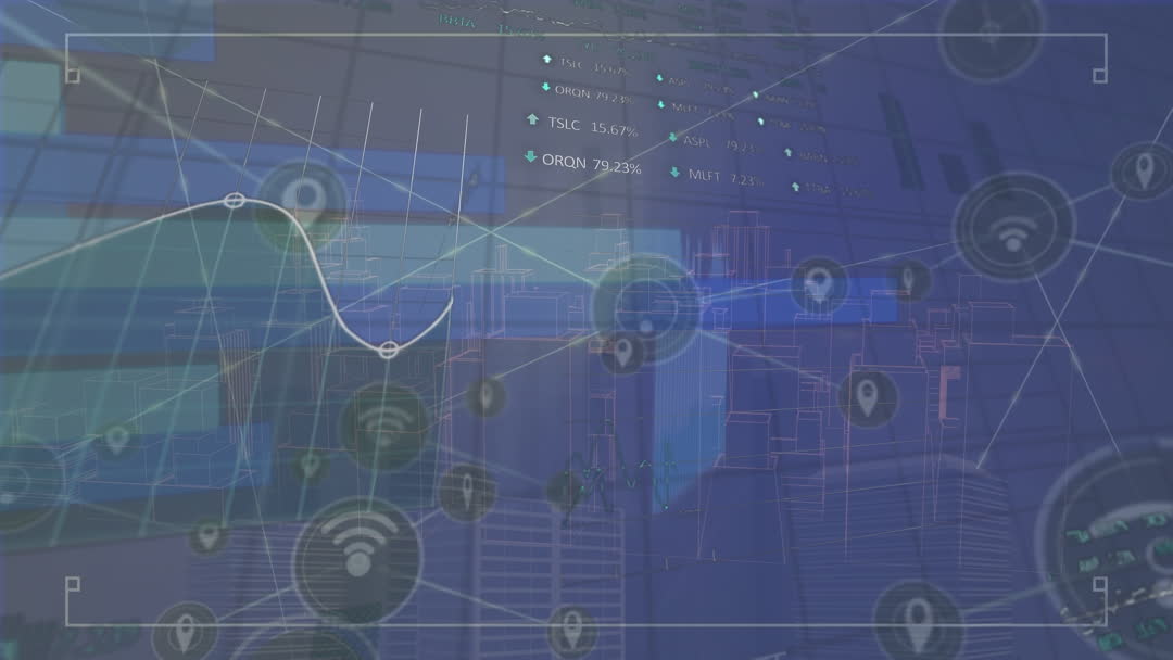 Conceptual video featuring digital network icons and data displays overlapping blue business graphs. Useful for presentations, technology and business solutions topics, demonstrating connectivity and global tech trends.