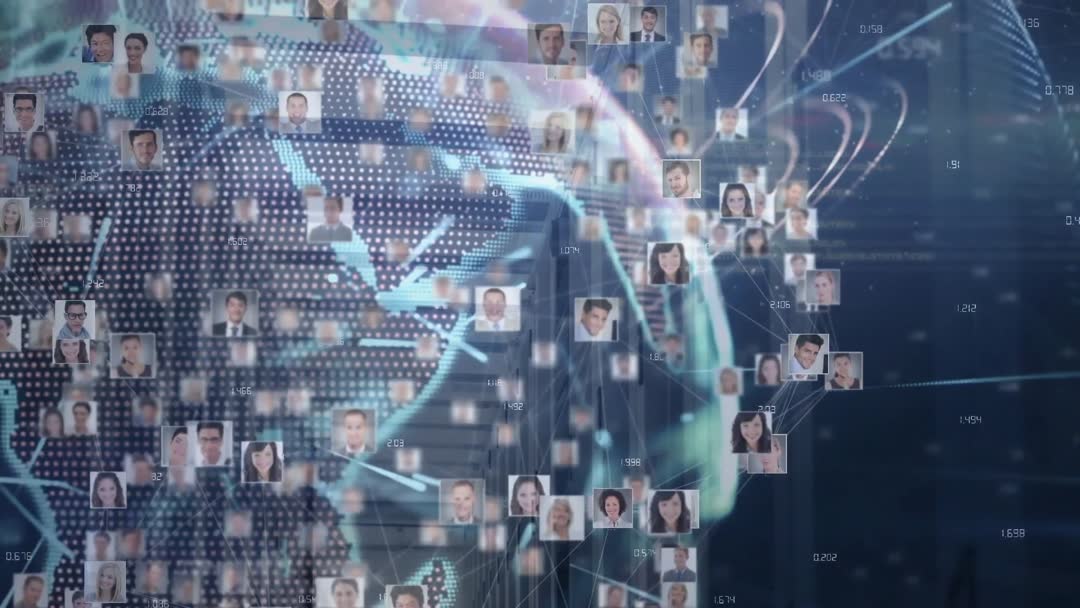 Visual emphasizing global corporate networking shows various professional portrait thumbnails intertwined with digital data in a high-tech blue landscape. The juxtaposition of technological elements with personal connections signifies extensive collaboration across borders. Utilize this to depict themes around global partnerships, virtual meetings or the power of digital ecosystems.
