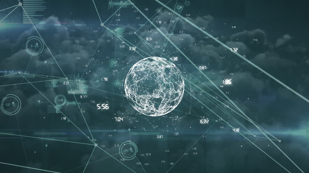 This illustration features a globe enveloped in interconnected digital lines with numerical data superimposed over a backdrop of sky and clouds. The video captures the essence of technological connectivity and is excellent for use in presentations or content focusing on global networking, information technology, or data analysis.