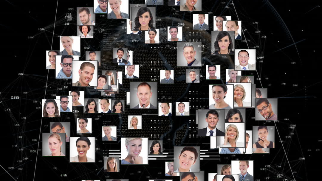 Collage of diverse business professionals overlaid on a globe, representing global networking and interconnectedness. Use for themes related to international business collaboration, networking platforms, and digital communications. Suitable for illustrating concepts in global workforce diversity and corporate technology solutions.
