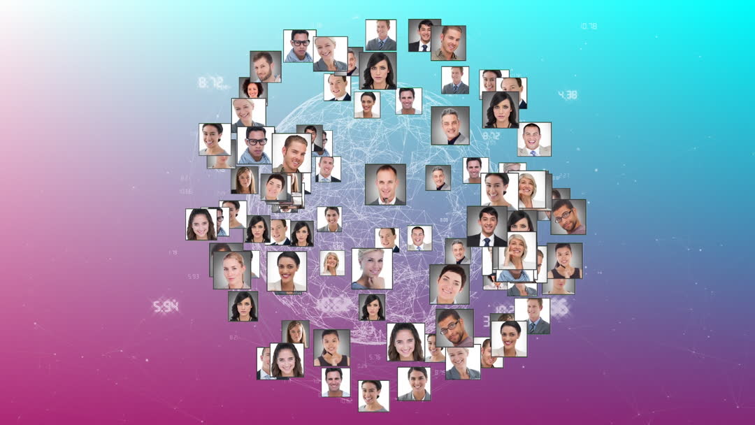 Various professional headshots surrounding a digital globe on a vibrant background. This representation emphasizes the concept of digital connectivity and global networking among diverse individuals. Ideal for illustrating themes related to global business, collaboration, technological innovation, and data interaction across borders in corporate media, presentations, or marketing campaigns.
