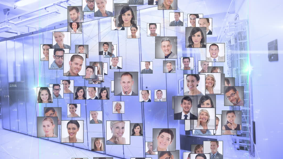 Visualization showing interconnected user profiles rotating around a globe over server room, illustrating theme of global networking and communication through technology. Useful for depicting concepts related to data, connections, information technology, as well as digital relationships and communication across tech platforms.