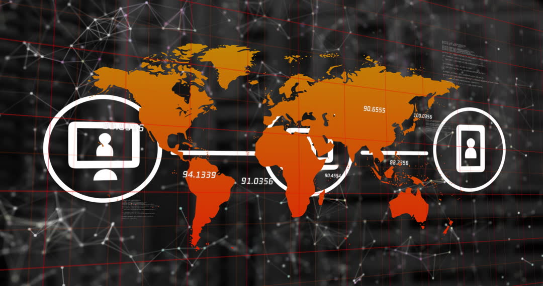 This visual showcases a digital world map highlighting global connections and data flow represented by icons. Ideal for articles, blogs, and presentations on cybersecurity, international connectivity, and information technology advancements.