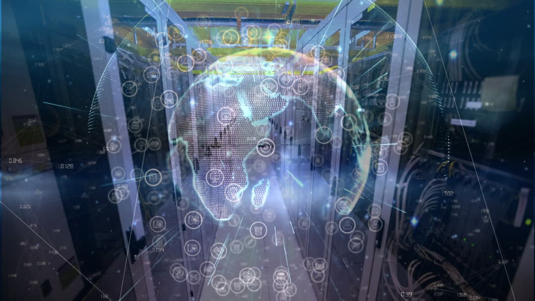 Globe overlaid with network symbols signifies advanced digital connections in a modern data center. Ideal for illustrating global communications, cybersecurity strategies, and IT infrastructure. Useful for tech-related content, blog posts, and presentations on internet of things or cloud computing advancements.