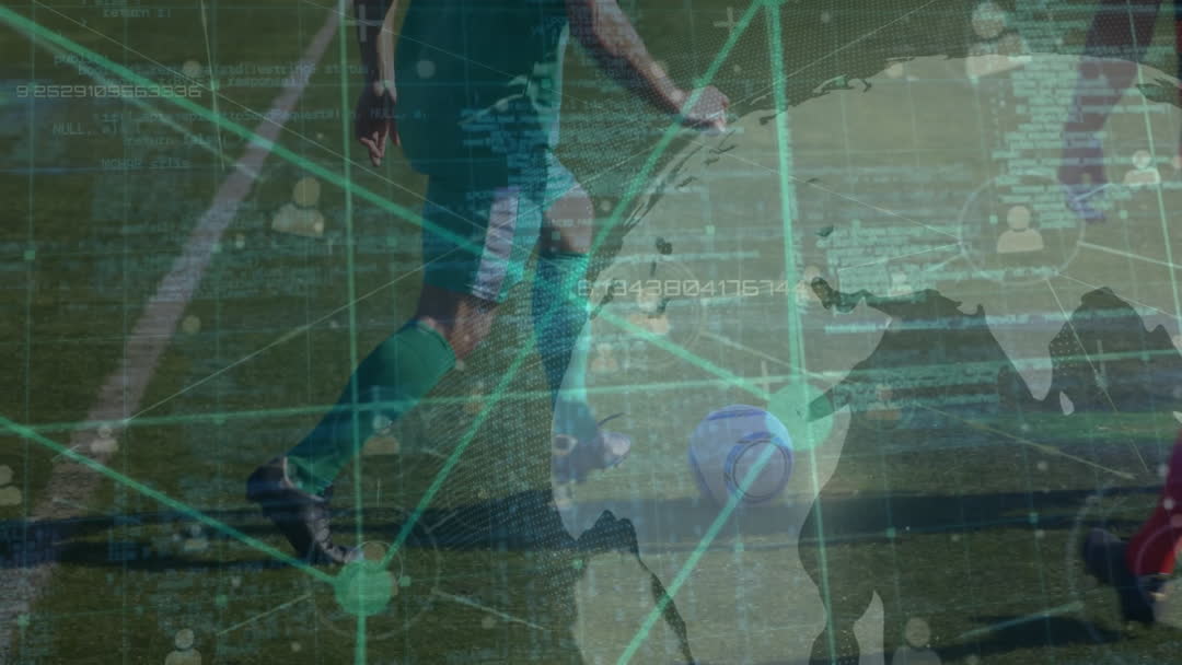 Overlay of global network illustrating technology's impact on sports. Ideal for articles or communications showcasing technological advancements in athletics and sports science.