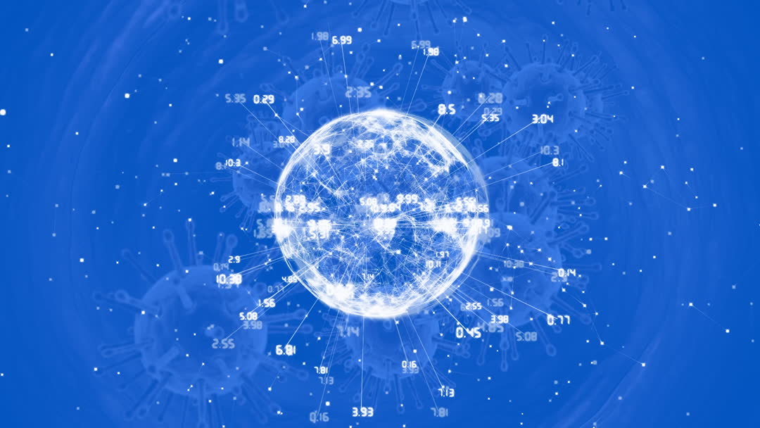 Depicting a globe intertwined with digital data and Covid-19 cell videory. Suitable for illustrating the intersection of global connectivity, research, technology, and the impact of the pandemic. Ideal for educational materials, technology trends presentations, and content on global health challenges.