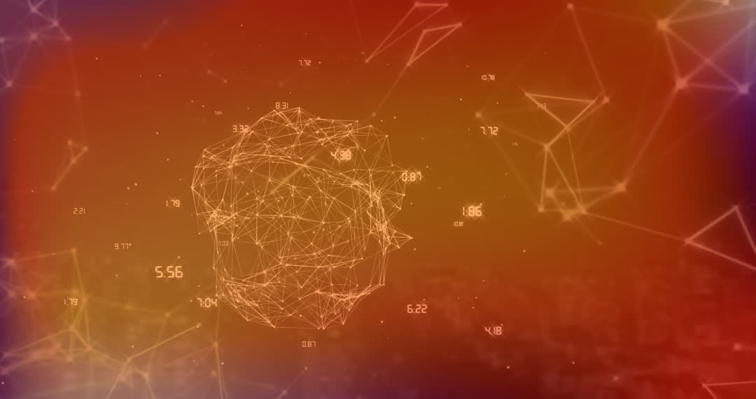 This visual artfully illustrates global connections and data processing through an animated network of numbers over a globe against an orange backdrop. It is ideal for using in presentations and marketing materials related to technology, data analytics, and digital communications, insofar conveying themes of connectivity and information flow.