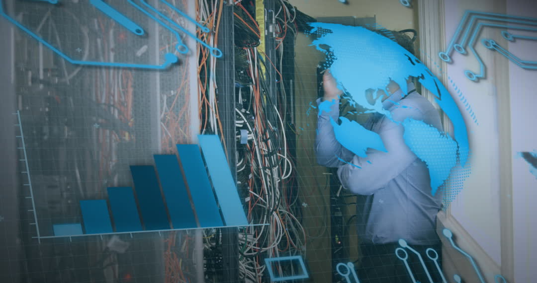 Illustrates digital global connectivity and networking concepts with an animation overlaying a globe, network circuits, and data charts. Perfect for technology presentations, educational videos on global tech innovations, or visualizing advancements in digital communication.
