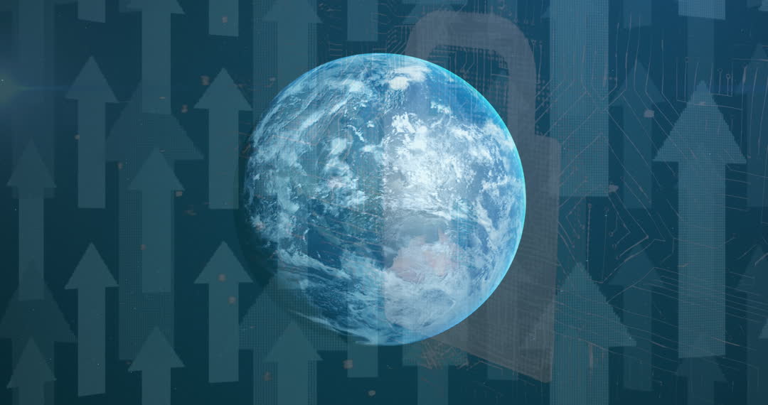 Animation displays earth with overlay of upward arrows, symbolizing worldwide connectivity and data flow. This suggests global networking opportunities in the financial and logistical sectors, with implications for cybersecurity enhancements. Ideal for use in presentations and reports focused on technological advancements or global business strategy.