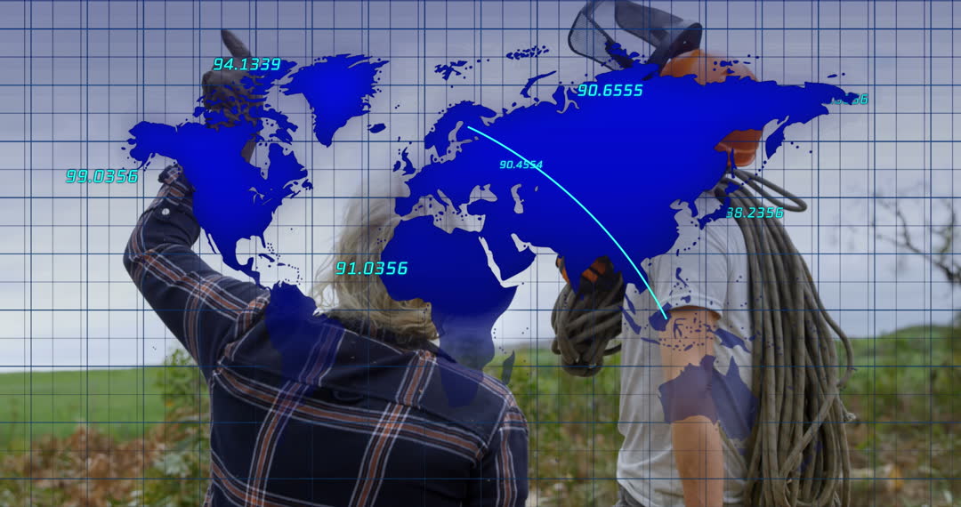 Two lumberjacks in work attire stand against a backdrop of an animated digital map highlighting global connections. The video represents the intersection of traditional forestry work with modern technological advances. This can be used in contexts highlighting innovation in agriculture, forestry technology, and global communication advancements. Excellent for concepts involving teamwork in diverse environments.