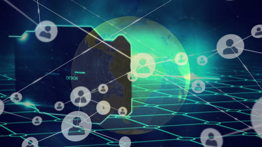 Animation showing interconnected profile icons linked over a digital network featuring text with a globe in the background symbolizes globalization, digital connections and the growing tech environment. Ideal for illustrating concepts of global communication, networking platforms, digital infrastructure, or cyber technology campaigns.