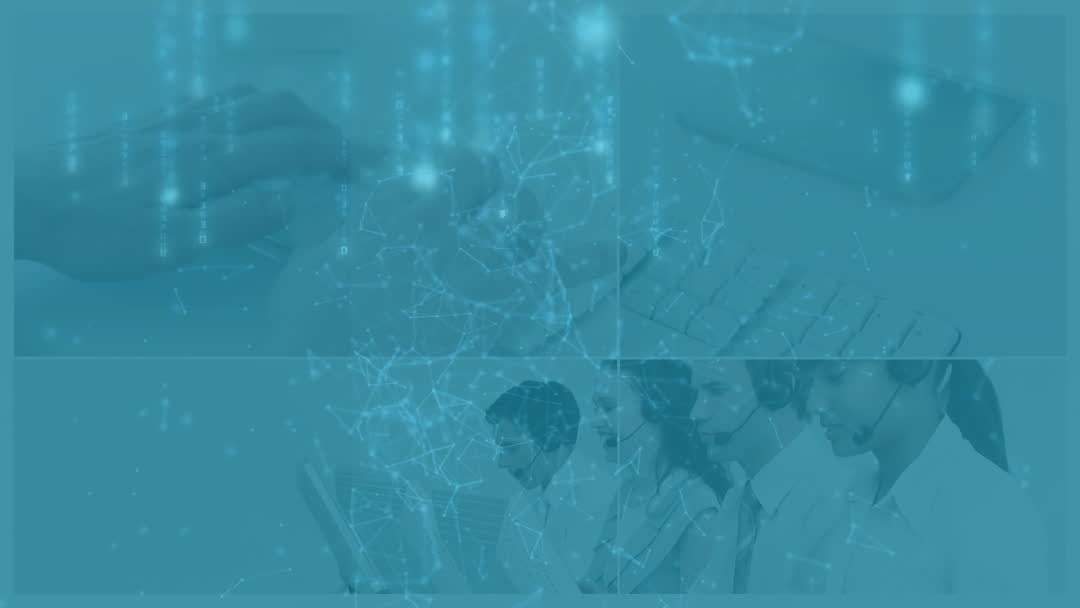 Collage illustrating customer service teamwork through digital networking technology. Presented with a plexus effect overlay, concept highlights connectivity in modern businesses. Suitable for use in presentations about telecommunication advances, global tech networking, or enhancing customer service strategies.