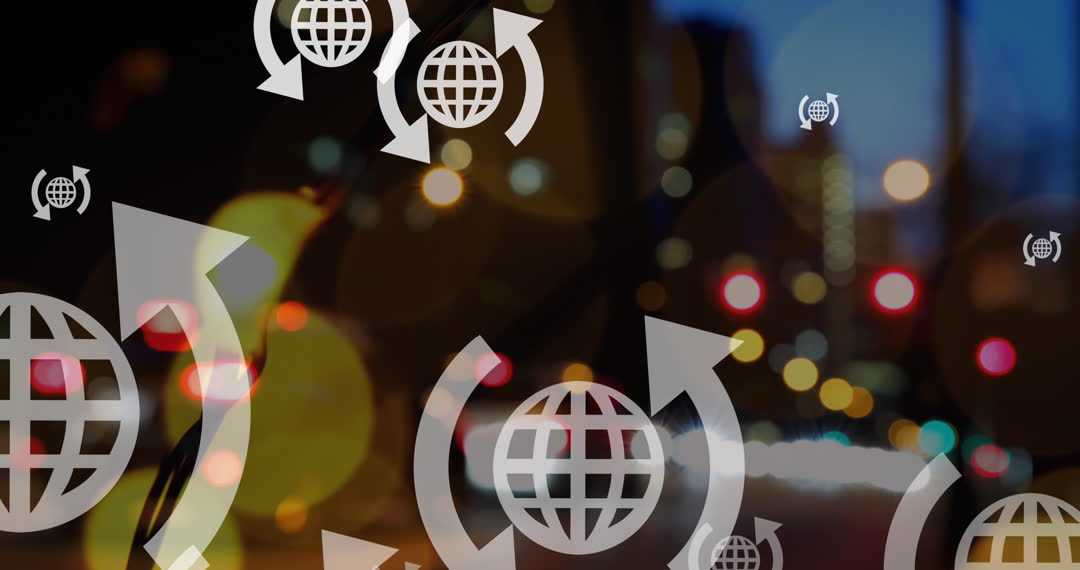 Abstract representation featuring globe and arrows icons overlaying blurred city lights. Ideal for showcasing themes of global connections, digital communication, data processing, business networking, and technological advancements in modern urban environments. Suitable for use in corporate presentations, marketing materials, and educational contexts promoting global business and technological collaboration.