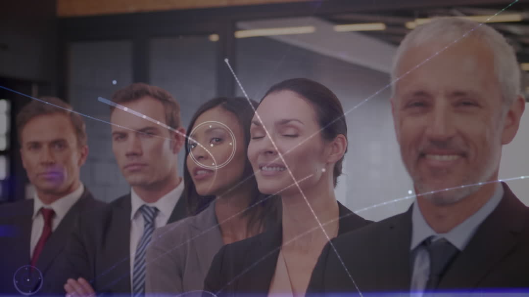 Business professionals with animated tech lines representing global connectivity inside an office space. Illustrates networking and teamwork in corporate environments, fitting for use in educational materials on technology, webinars, presentations on business and tech innovations, or corporate advertisements showcasing collaborative work culture.