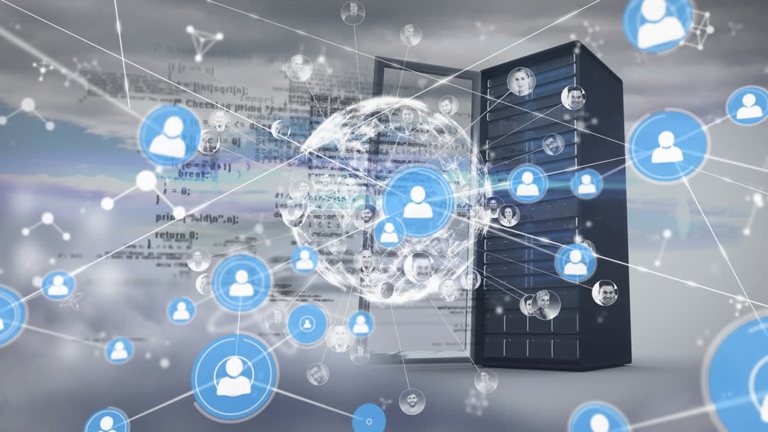 Symbolic illustration of global networking technology showing interconnected profile icons surrounding a server and spinning globe. Useful for representing cybersecurity, IT infrastructure, and digital communication concepts. Ideal for use in technology industry presentations, cybersecurity briefings, network management promotions, and articles about cloud computing advancements.