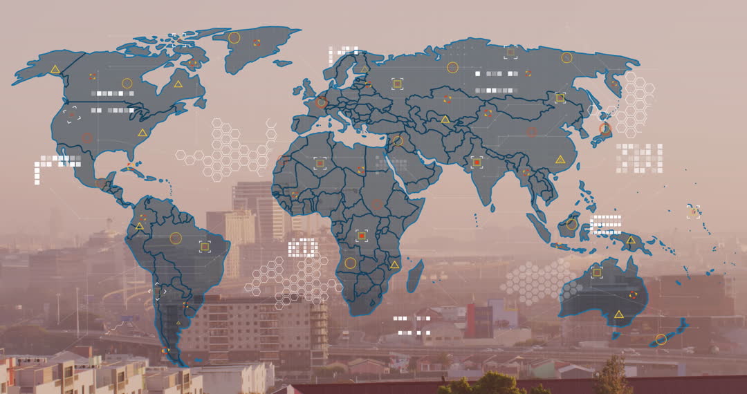 Projection of a digital world map with various data points layered over a cityscape, illustrating global connectivity and business technology concepts. Ideal for use in presentations or media related to technology, global communications, business analytics, urban planning, or environmental impact visuals.