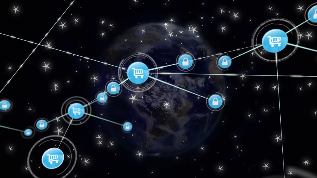 This digital illustration presents a network of shopping cart icons and lock symbols connected across a starfilled space, representing secure global e-commerce connections. The Earth displayed in the background signifies international digital commerce linked through secure internet transactions. This video is ideal for use in technology, online security, or e-commerce related projects. It can be used in presentations, promotional materials, and articles focusing on online business, cybersecurity efforts, and digital innovation.