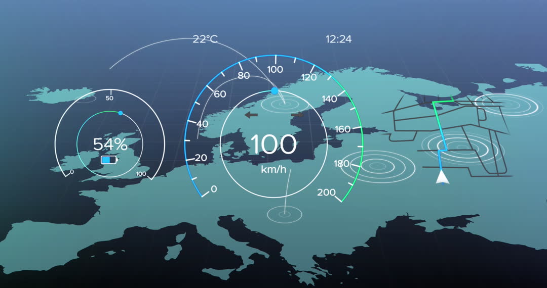 Features animated global map with interconnected links and dynamic digital speedometers. Ideal for illustrating concepts of global technology, networking, digital synchronization, and data exchange in tech presentations or educational materials.