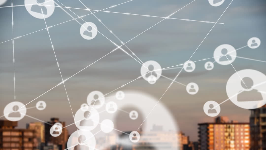 This abstract illustration showcases a network of white profile icons interconnected over a cityscape, symbolizing global connectivity and networking in urban settings. The video is ideal for use in presentations, digital marketing, or web design projects related to business technology, communication, and modern digital networks.