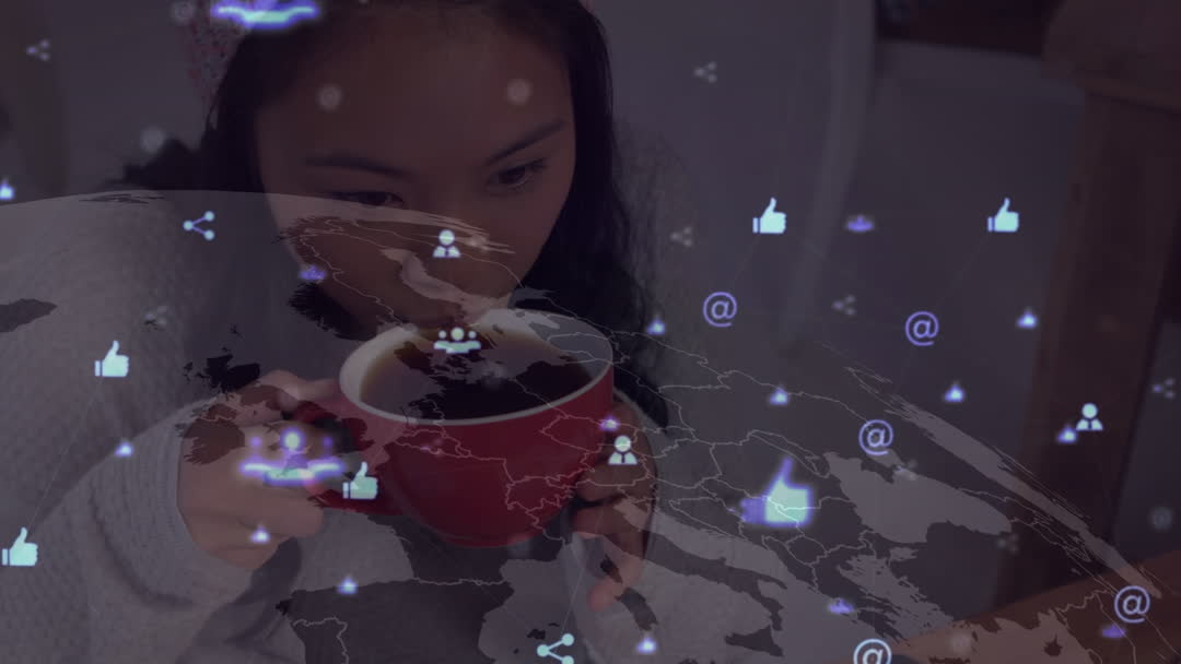 An asian woman enjoys coffee while a digital data layer with global networking icons superimposes on the background. This video conceptually represents connectivity and data flows around the world, making it ideal for use in presentations and content that explore topics such as international business, technological advancement, and digital communication strategies.