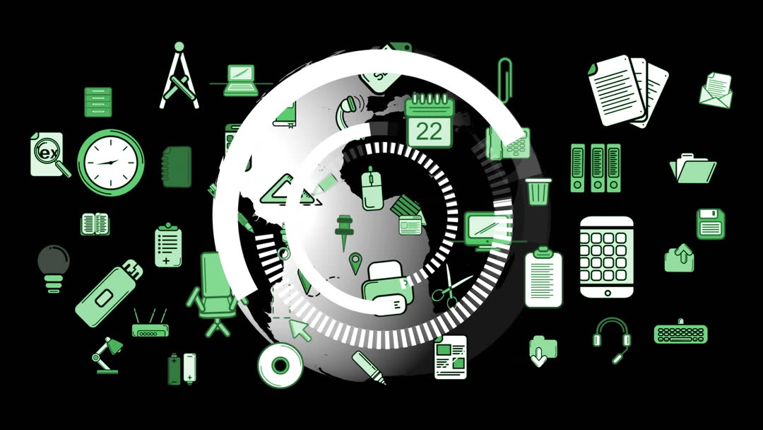 Visualization depicts interconnectedness through digital icons around a globe concept. Animated scanner emphasizes technological evolution and global connectivity. Ideal for presentations on global business strategies, tech innovations, or digital networks. Effective for illustrating concepts of global communication, data exchange, and technological advances in business contexts.