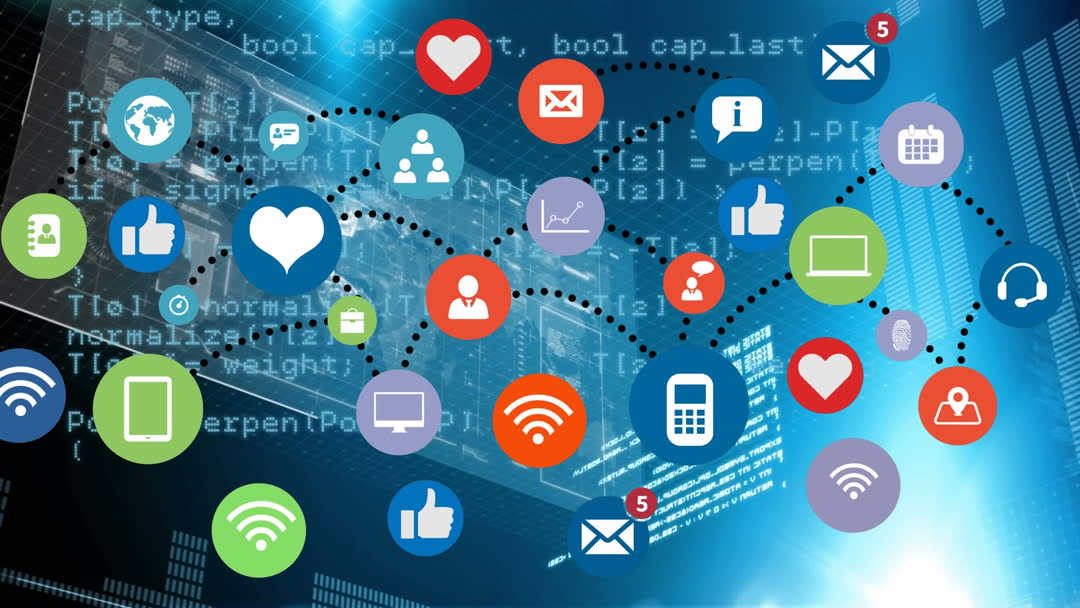 Digital rendering showing various technology and social media icons against a data-inspired background, suggesting themes of global communication and interconnectedness. Such videory is ideal for illustrating topics in technology blogs, articles on social networking, marketing presentations about online engagement, and educational materials explaining digital communication processes.