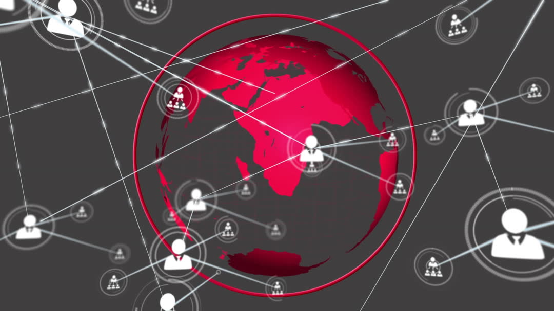 Animation of a red globe spinning amidst intricate network connections, featuring profile icons on a grey backdrop. This digital representation of worldwide networking and communication is ideal for illustrating concepts in global business meetings, technological developments, and international relations. Suitable for presentations, technological webinars, and infographics about globalization and digital connectivity.