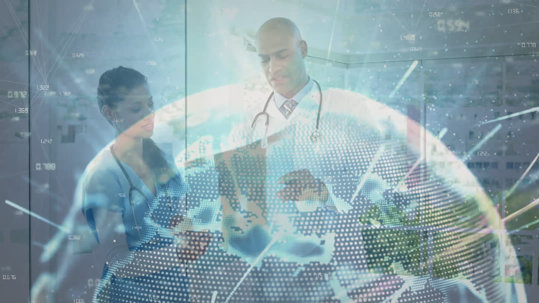 Professionals discuss medical data amidst digital and global security visuals, symbolizing advances in healthcare technology and data protection. Useful for representing innovative online security solutions in healthcare environments, illustrating global data management networks, and showcasing modern medical information systems.