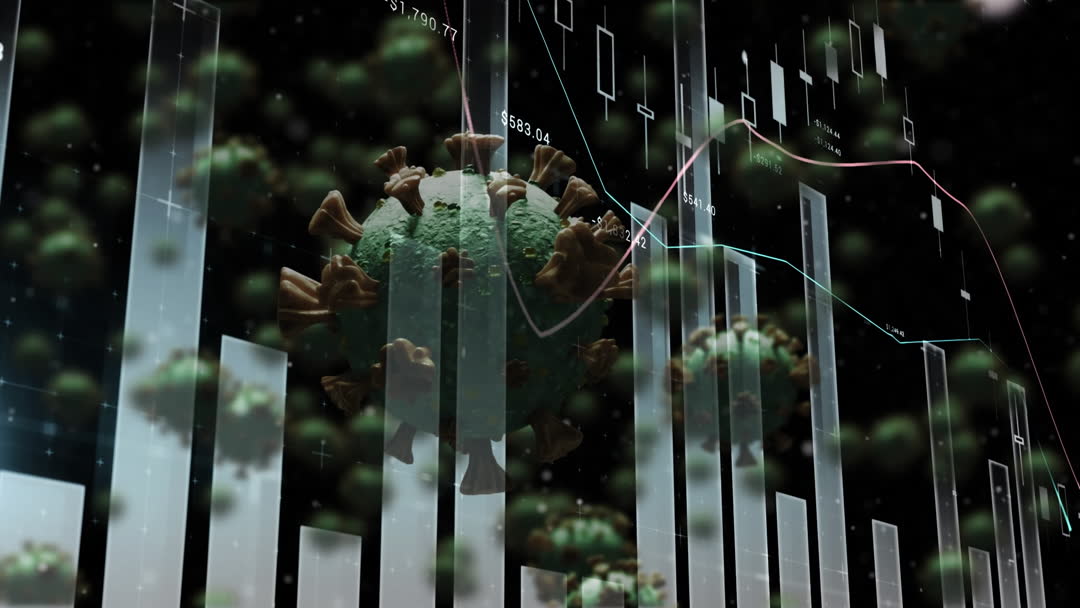 Visual representation of the coronavirus impact on global economic trends, featuring overlapping videos of a virus and financial charts. Useful for presentations and articles on pandemic economic effects, financial analysis, or statistics in health crises.