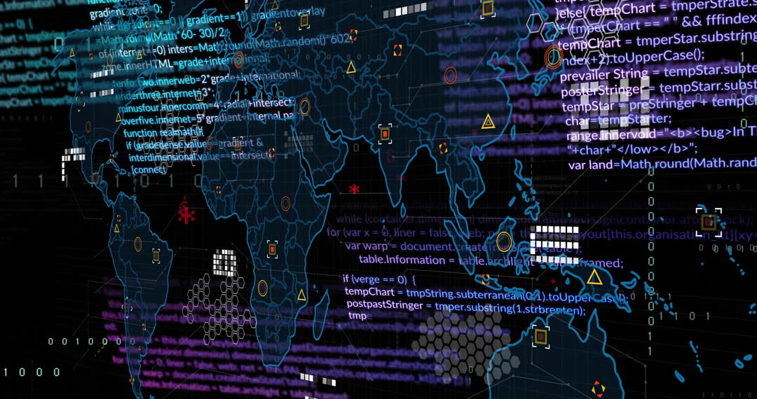Complex digital display with overlaid code features global map and circuit elements, conveying themes of international connectivity and technological advancement. This visualization is useful for illustrating concepts in software development and global IT infrastructure, suitable for blogs on technology progress or educational purposes in programming courses.