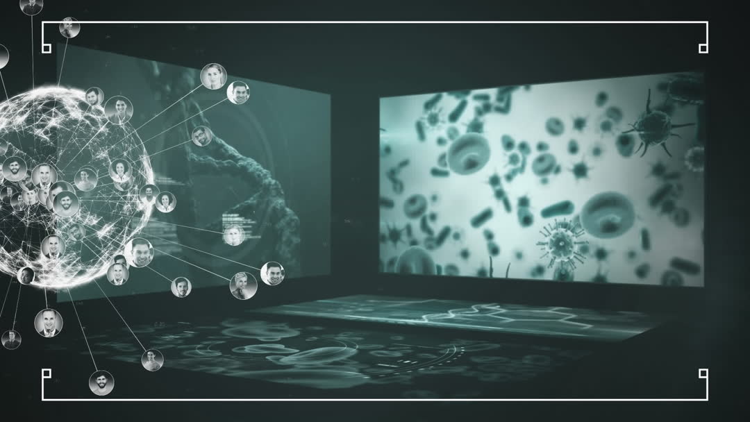 Dynamic depiction of global science and technology networks with an animated globe featuring interconnected people. Ideal for themes focused on global communication, technological innovation, digital connections, and informational presentations in educational or corporate environments.