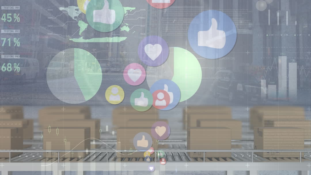 Animated visualization portrays the fusion of logistics and digital technology with overlaid social media icons and financial data graphics on conveyor belts. Ideal for illustrating concepts in global commerce, modern logistics, digital marketing strategies, or the impact of digital interaction on traditional industries. Suitable for presentations, marketing campaigns, and articles focused on global trade and digital innovation.