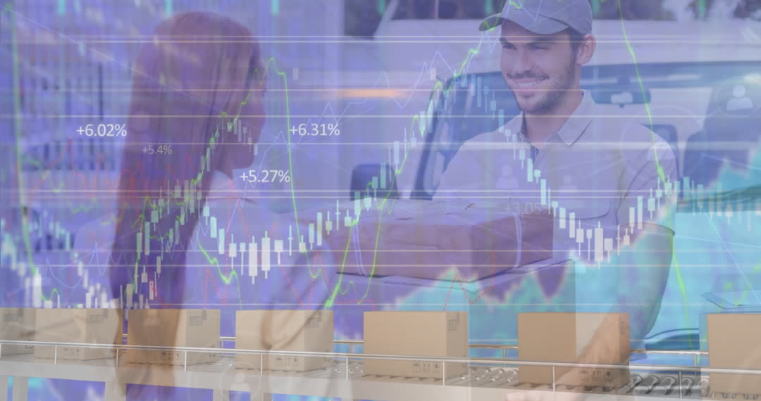 Visualization of financial data combined with global shipping activities and office teamwork shown in a dynamic overlay. Suited for presentations on international trade, logistics solutions, logistical challenges, market analysis, and creative uses in finance or economic-themed content.