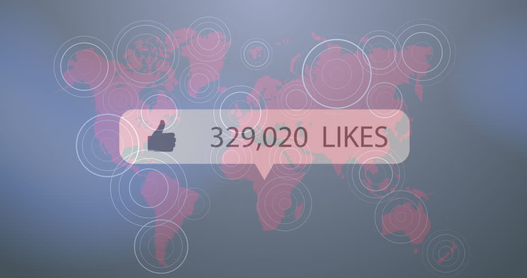 This video features a digital representation of a world map with a social media 'like count' prominently overlaid. The likes signify worldwide user engagement and interaction. Wide concentric circles suggest global connectivity and networks. Suitable for illustrating themes around global social media interactions, digital engagement statistics, or worldwide connectivity insights.