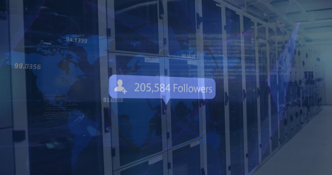 Overlay of social media follower count on data server. Ideal for illustrating global connectivity, digital networking, and technology-related themes unified by social media concepts. Can enhance articles, blogs, or presentations on the rise of big data, online communities or cloud computing.