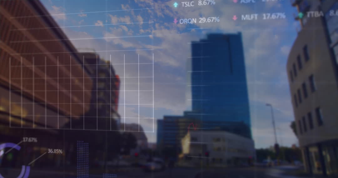 - Global Stock Market Analytics Overlaid on Cityscape with Tall Buildings