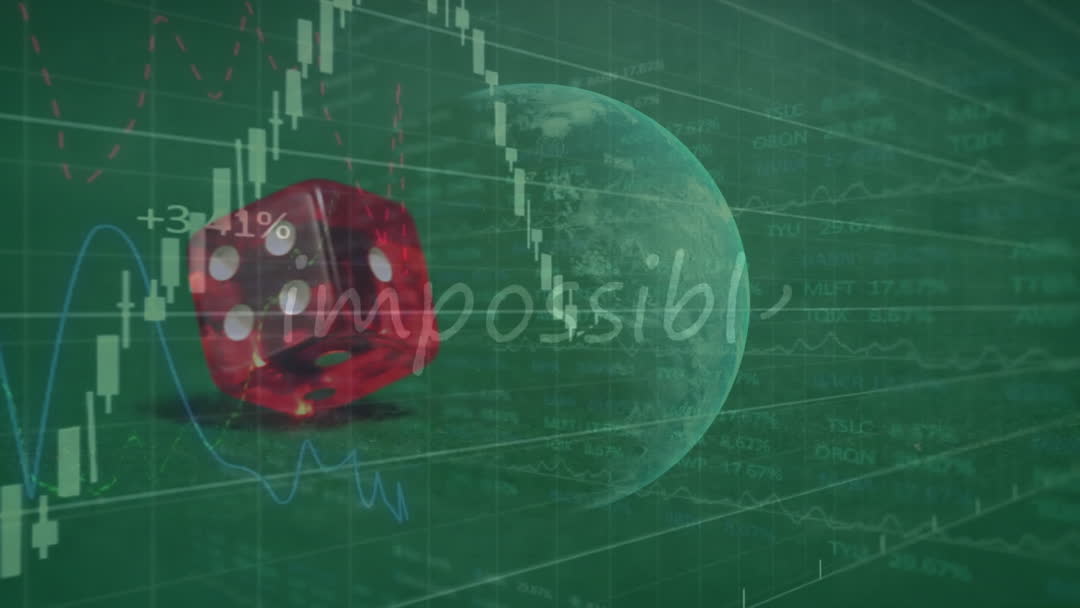 Digital depiction of financial instability with a red dice rolling on stock market graphs overlaid with a spinning globe marked with 'impossible'. Symbolizes unpredictable financial markets and the risk involved. Useful for illustrating concepts of economic volatility, financial forecasting, gambling metaphor in business, global data processing, and speculative investment strategies.
