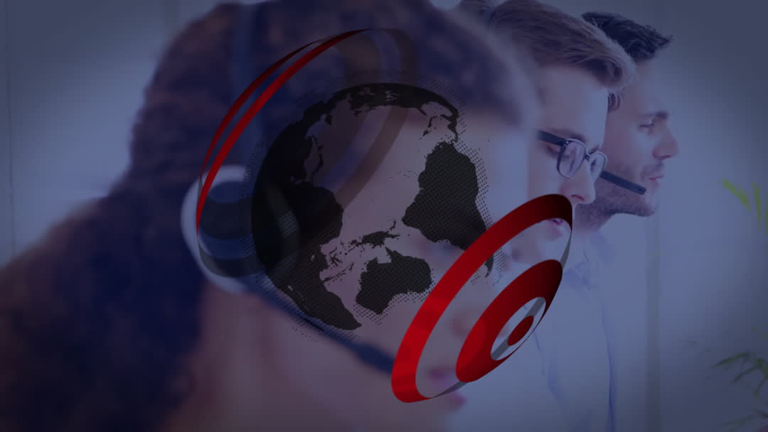 Visual represents global communication in offices with multicultural team using headsets, digified with digital globe overlay symbolizing connections. Suitable for concepts related to international customer service, technology solutions in business, and global finance. Ideal for marketing materials focused on customer service tools or business automation.