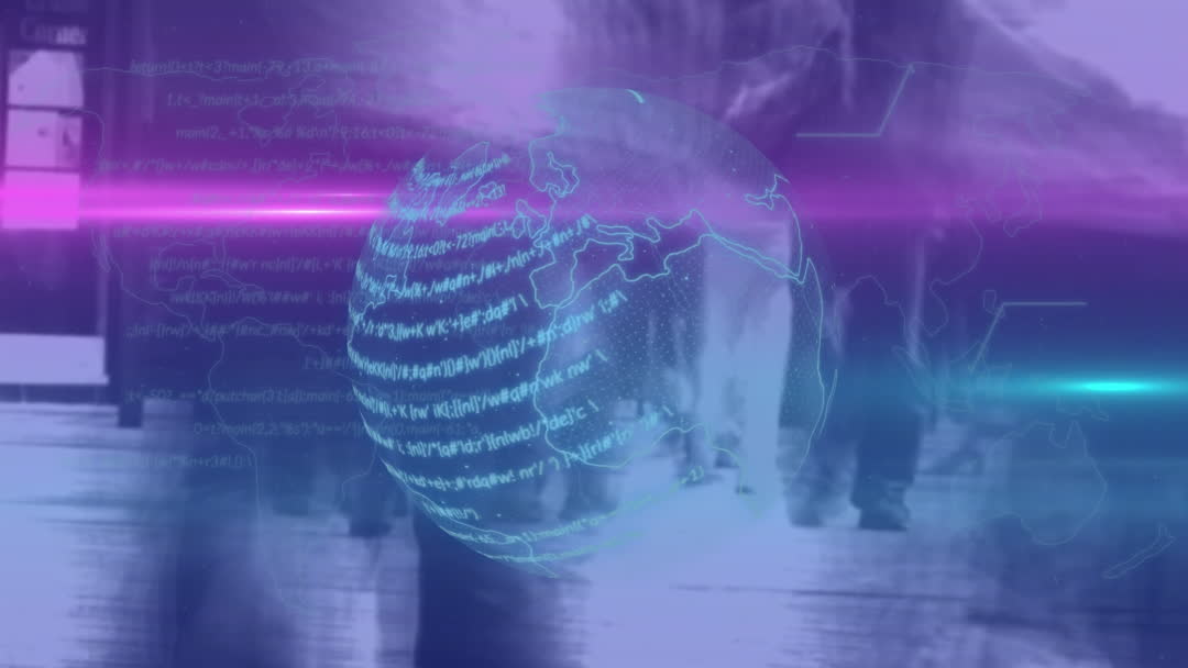 This video artfully combines digital elements of global connectivity and data with a motion blur of people walking on a street. Ideal for technology-themed presentations and articles that discuss globalization, network connections, and digital transformations, it conveys the seamless integration of tech and everyday life.