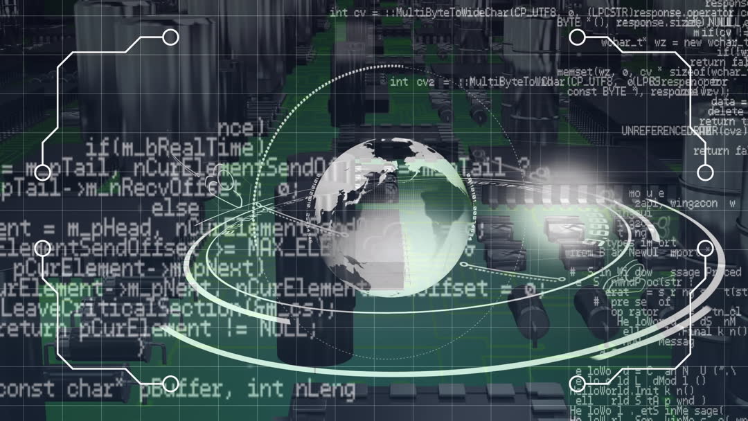 This digital illustration showcases an animated globe surrounded by data processing elements over a computer circuit board. The visual represents themes of global connectivity, advanced technology, and computerized operations. Appealing for technology and computing-themed content, websites focused on IT innovations, and global data visualization presentations.