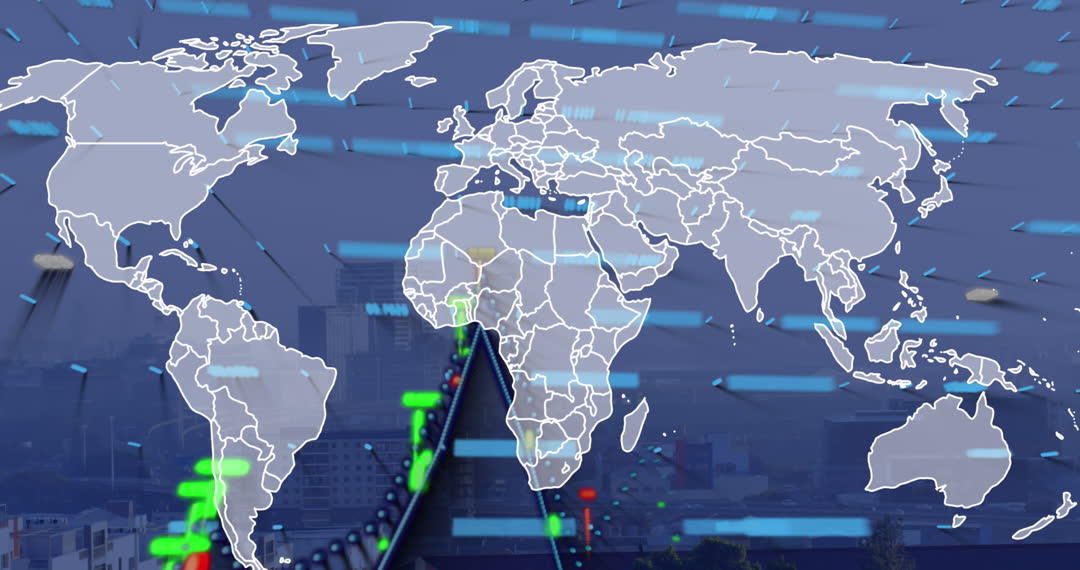 Illustration combines animation of graphs with world map and cityscape, representing globalization in technology, business, and finance. Suitable for presentations, financial reports, tech-focused articles, and educational materials about global economic trends and innovations.
