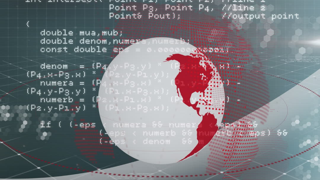 Dynamic animation of a digital globe with a background of data processing and code symbols abstracts the concept of global technology integration. Ideal for presentations on cybersecurity, technological innovations, digital business strategies, and information technology solutions.