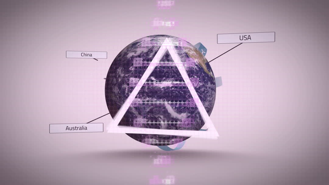 This digital animation features a globe overlaid with a triangular geometric shape and a DNA strand, marked with country indicators pointing to important global regions like the USA, China, and Australia. Ideal for presentations on biotechnology, global communications, or digital innovation showcasing a futuristic networked world.